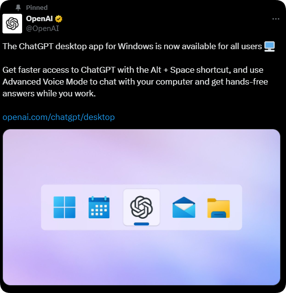 2024年11月15日,ChatGPT客户端大更新就是ChatGPT for Windows终于上线了虽然只是内部包了个网页,不过一个非常重要的地方是不用全局代理也可以进行使用。使用全局代理的用户可以不在全局代理和系统代理之间来回切换。由于ChatGPT会引导用户使用Windows Store进行安装。朋友们急需一个离线安装包,今天它来啦。ChatGPT for Windows 点击下载 (访问密码: 7395)ChatGPT for Mac 点击下载 (访问密码: 7395)